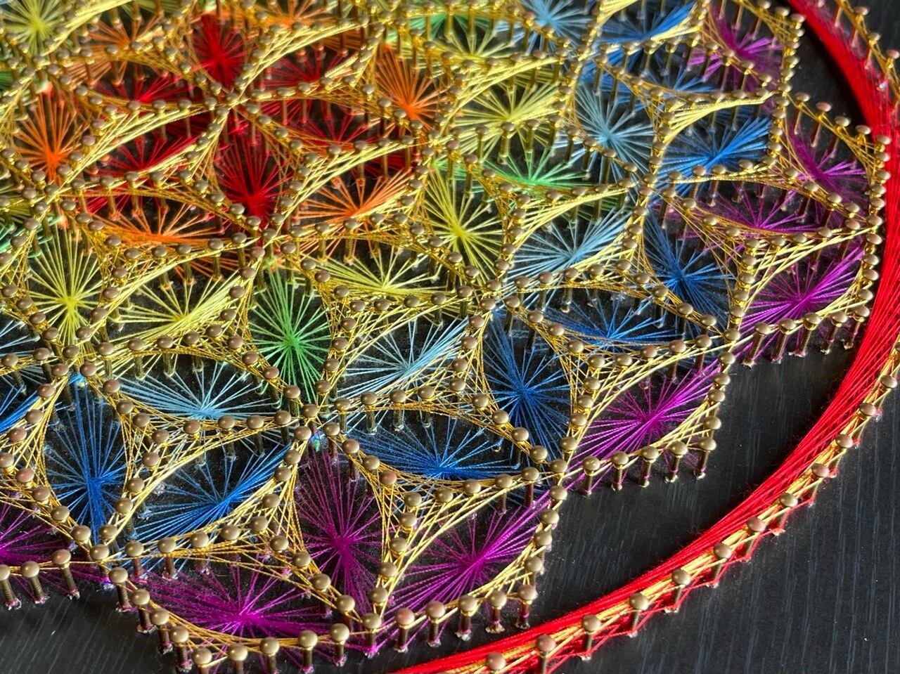 板に釘を打ち糸をかけて、神聖幾何学模様のフラワーオブライフを表現しました。